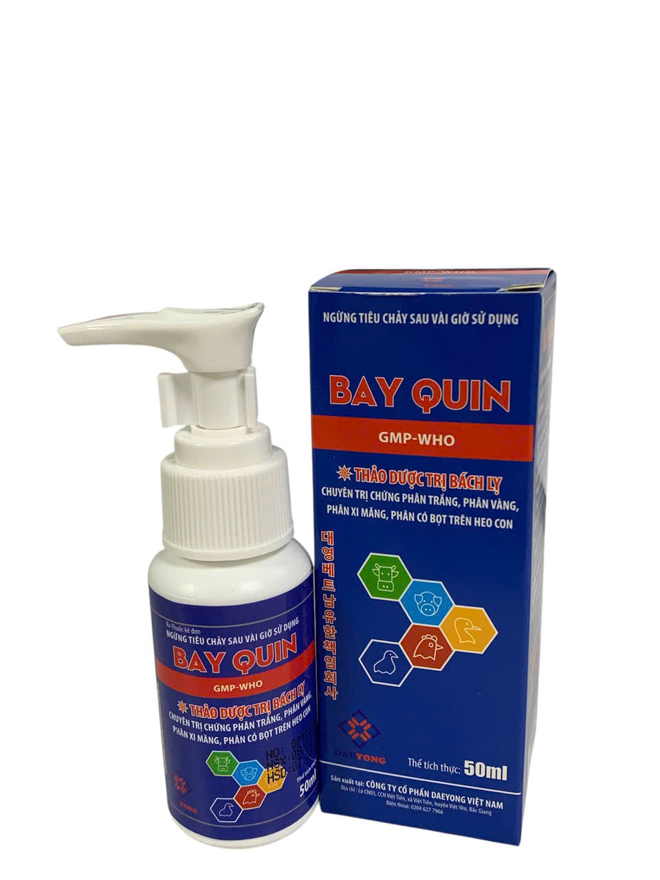 - BAY QUIN - Thảo dược trị bách lỵ được bào chế kết hợp kháng sinh với công thức thảo dược bí truyền độc đáo . Tạo ra một sản phẩm đặc chủng chủ trị các chứng tiêu chảy phức tạp trên con heo , có độ nhạy cảm cao mà không lo nhờn thuốc như : Heo con tiêu chảy phân trắng , phân xi măng , phân vàng nhớt , phân có máu , phâ loãng có bọt .